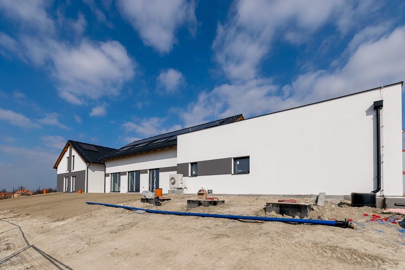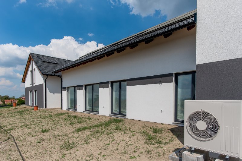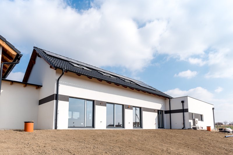 NADČASOVÉ BYDLENÍ V ENERGETICKY ÚSPORNÉM DOMĚ S FOTOVOLTAICKÝMI PANELY NA STŘEŠE S ULOŽENÍM PŘEBYTEČNÉ ENERGIE DO BATERIÍ A TEPELNÝM ČERPADLEM.